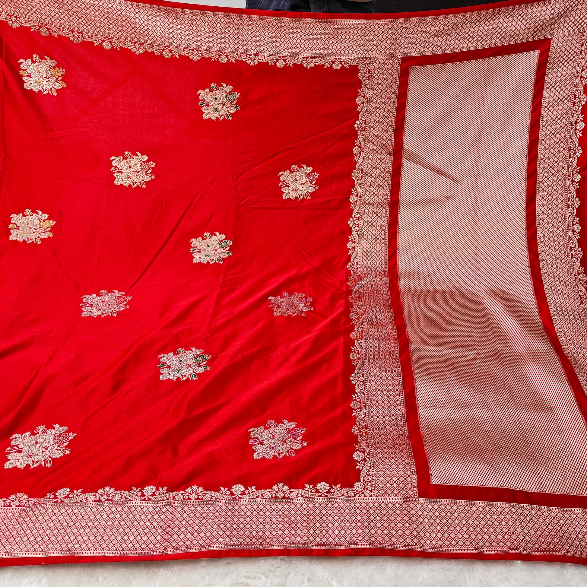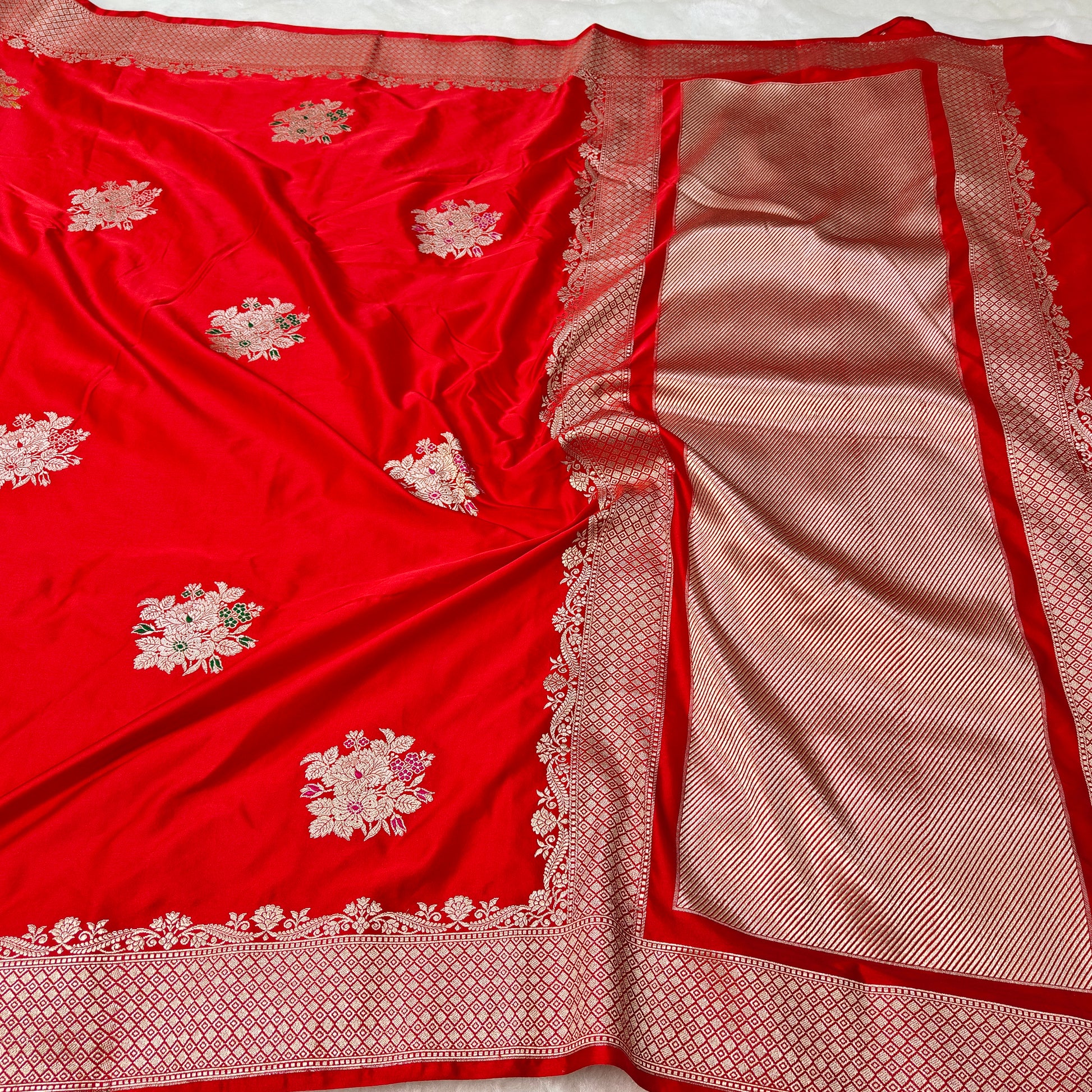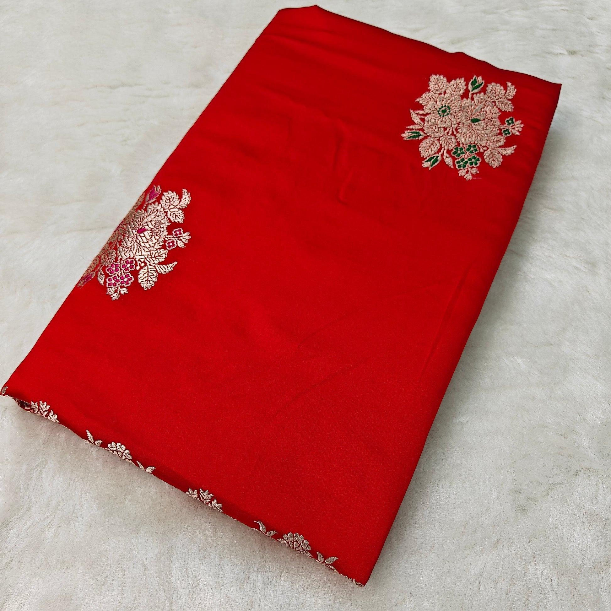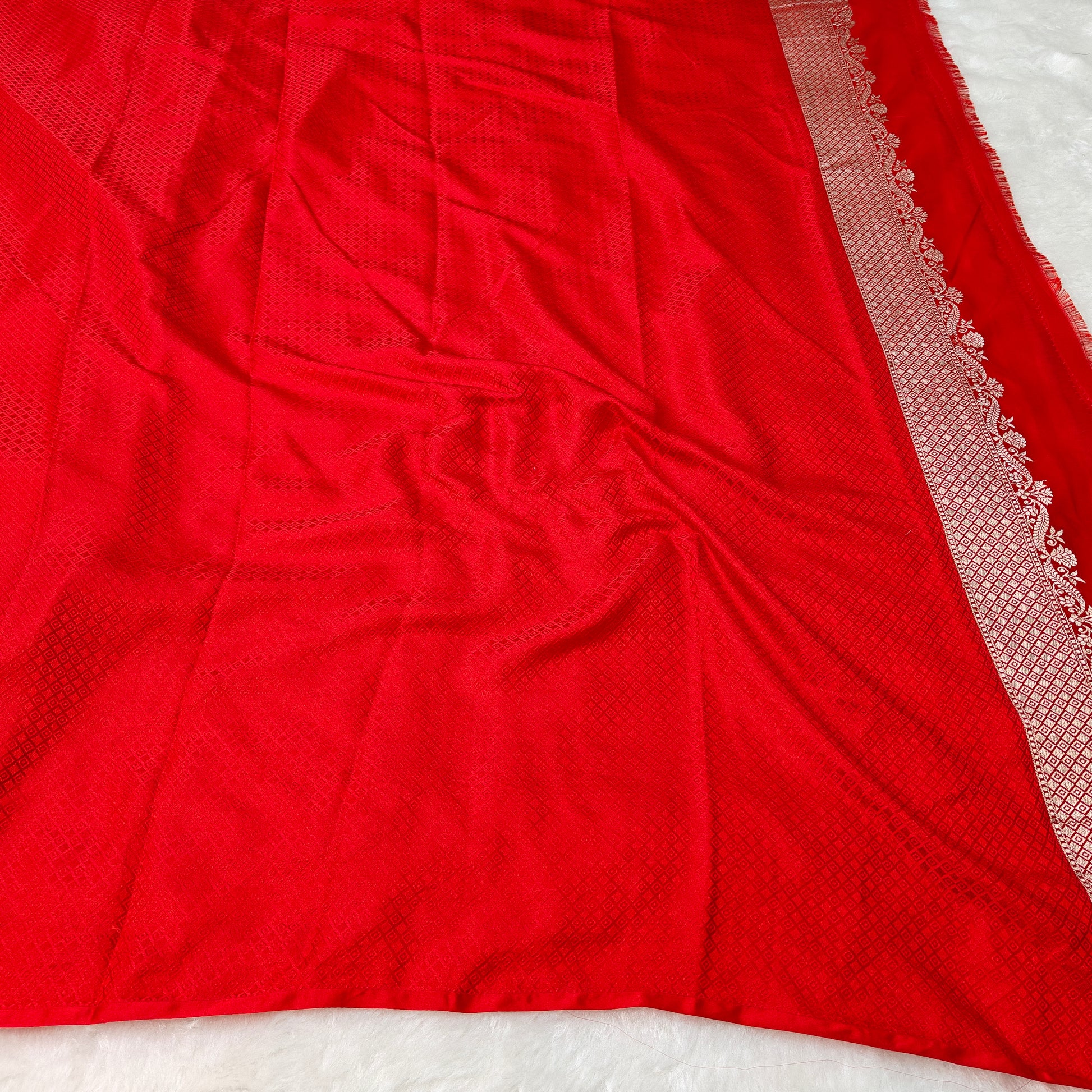 This Pure Red Mashru Silk Saree is crafted from high-quality mashru silk, known for its luxurious texture and durability. The vibrant red hue enhances visual appeal, making it suitable for formal occasions. The fabric's breathable nature ensures comfort, while its elegant drape complements various body types.